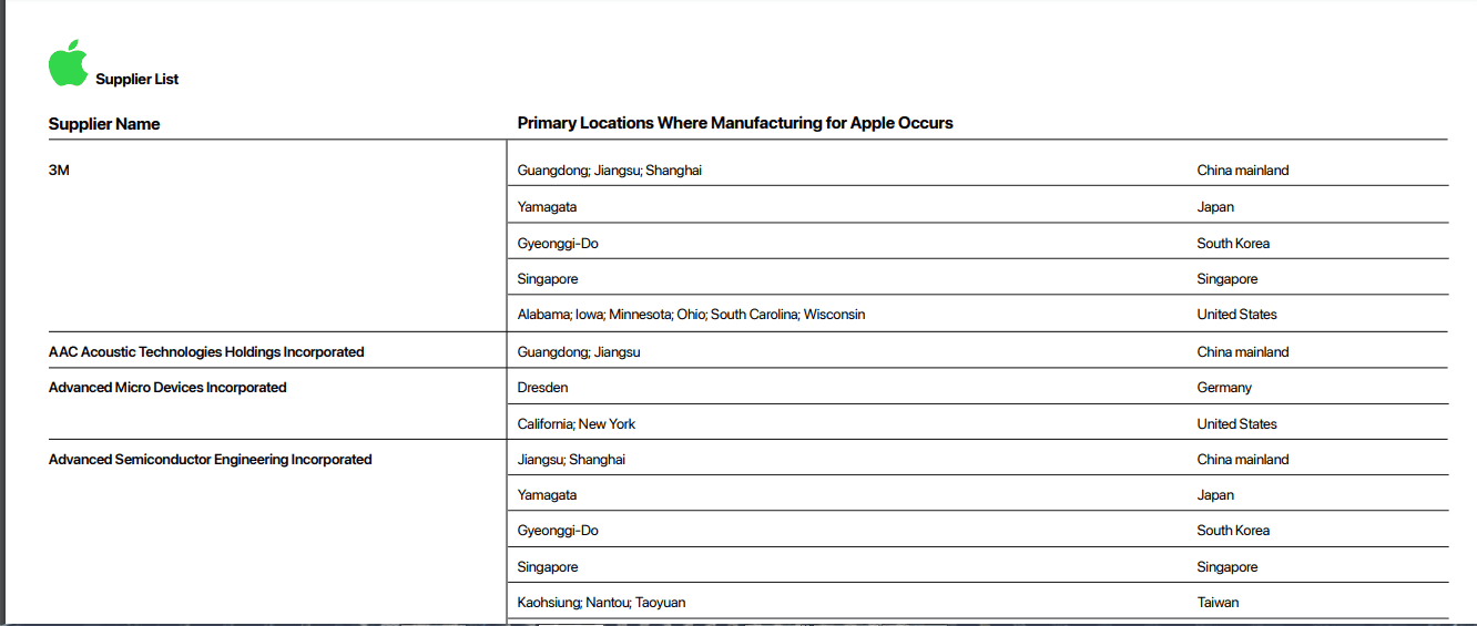 Figure 2 Sectional Snippet of Apple's Suppliers List