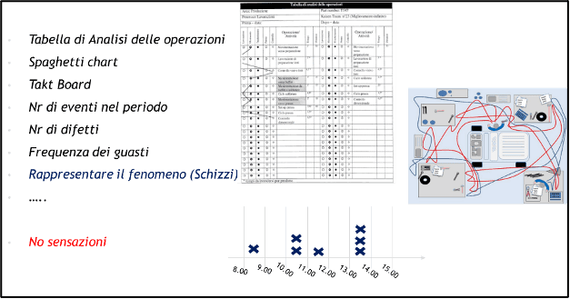 - Misurazione del tempo ciclo, movimenti e sprechi (es. Spaghetti Chart, Work Combination Table).