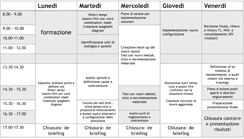 Il workshop Kaizen è stato strutturato, giorno per giorno con il seguente calendario: