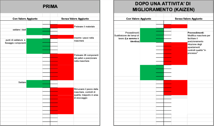 Fig 1 – Esempio Analisi attività sulla base del VA Prima e dopo un Kaizen