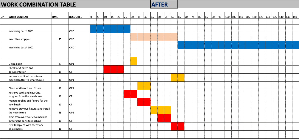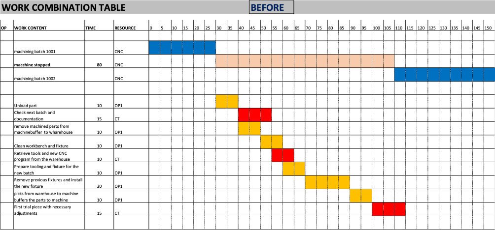 - Work Combination Table, ovvero un diagramma che mostra ogni attività eseguita durante il setup, il tempo richiesto e le sovrapposizioni possibili.