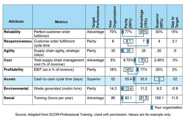Questo modello, ampiamente riconosciuto a livello globale, può essere utilizzato ed integrato con successo nell'applicazione pratica durante la trasformazione della supply chain. Il Modello SCOR è descritto come strumento dinamico per valutare, migliorare e ottimizzare le operazioni lungo tutta la Supply Chain. Il modello non viene approfondito, visto che questo è un tema oggetto del corso specifico SCOR-DS, ma vi si fa molto spesso riferimento per determinare su quali aree ci si vuole incentrare e dove avviare un benchmark per individuare i GAP (vedi sotto un esempio di benchmark).