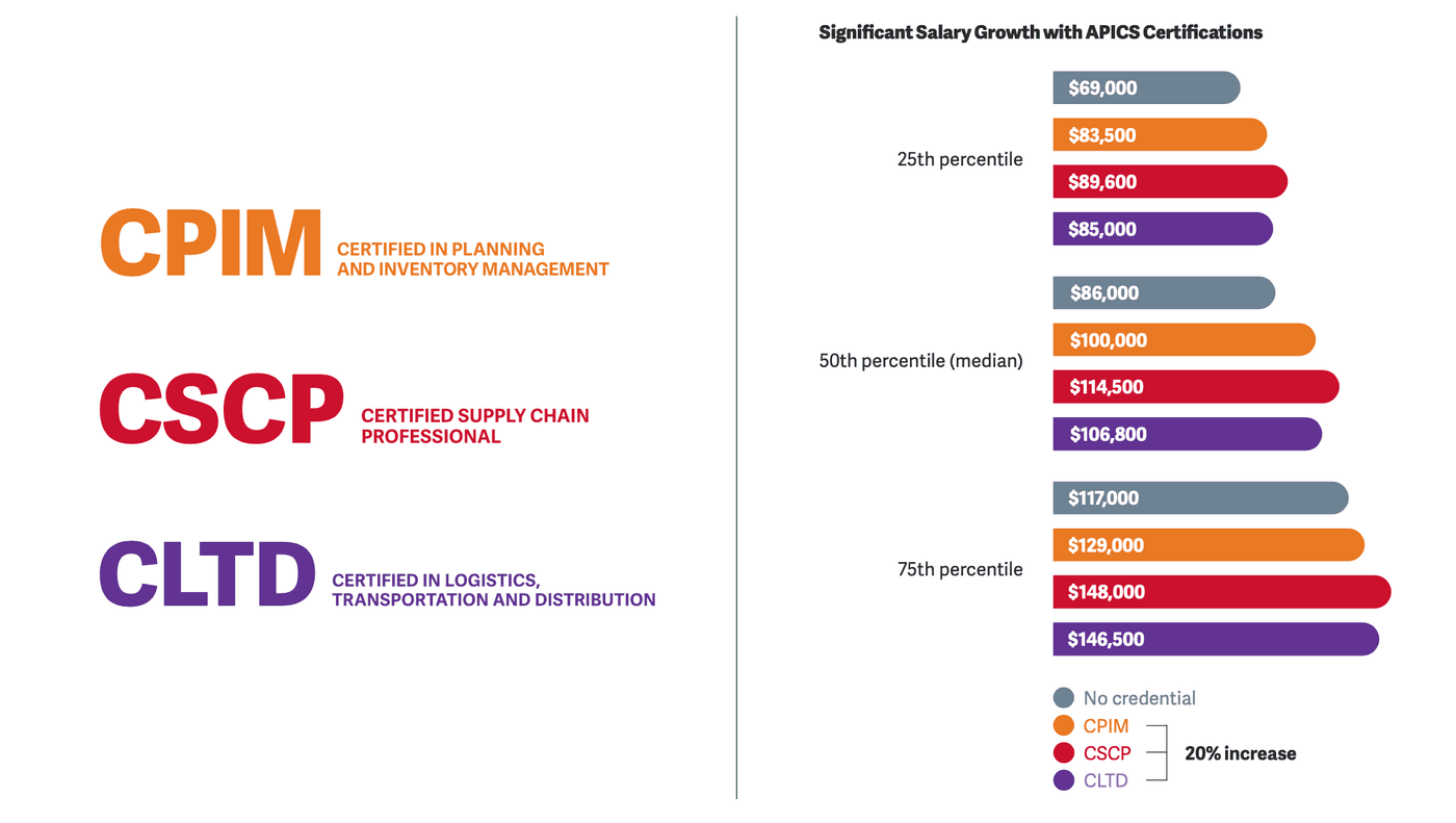 Uno dei dati più significativi riguarda l’effetto della certificazione APICS (CPIM, CSCP, CLTD) sul reddito: i professionisti certificati guadagnano in media il 20% in più rispetto ai colleghi senza certificazioni. La combinazione di una laurea in Supply Chain Management con almeno una certificazione APICS porta il salario mediano a 100.000 dollari, contro gli 85.000 di chi non è certificato.