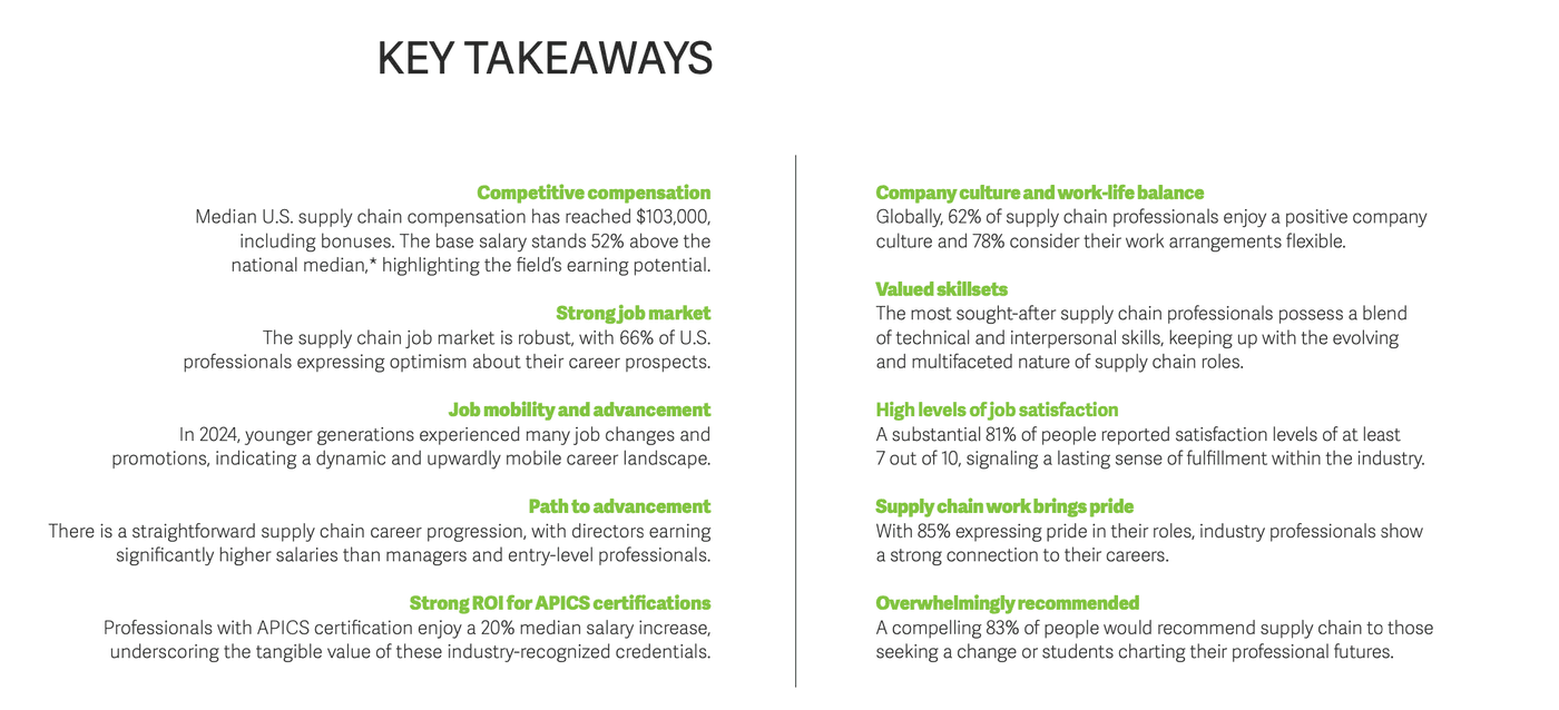 Il Supply Chain Salary and Career Report di ASCM del 2025, basato sulle risposte di oltre 3.500 professionisti a livello globale, conferma un dato chiave: la Supply Chain non è solo un settore strategico per l’economia, ma anche una scelta di carriera con ottime prospettive economiche, stabilità e soddisfazione personale. Inoltre, il sondaggio conferma che le certificazioni APICS consentono al professionista di avere un salario del 20% superiore a quello medio del mercato. Di seguito, illustriamo alcuni messaggi chiave del Report.